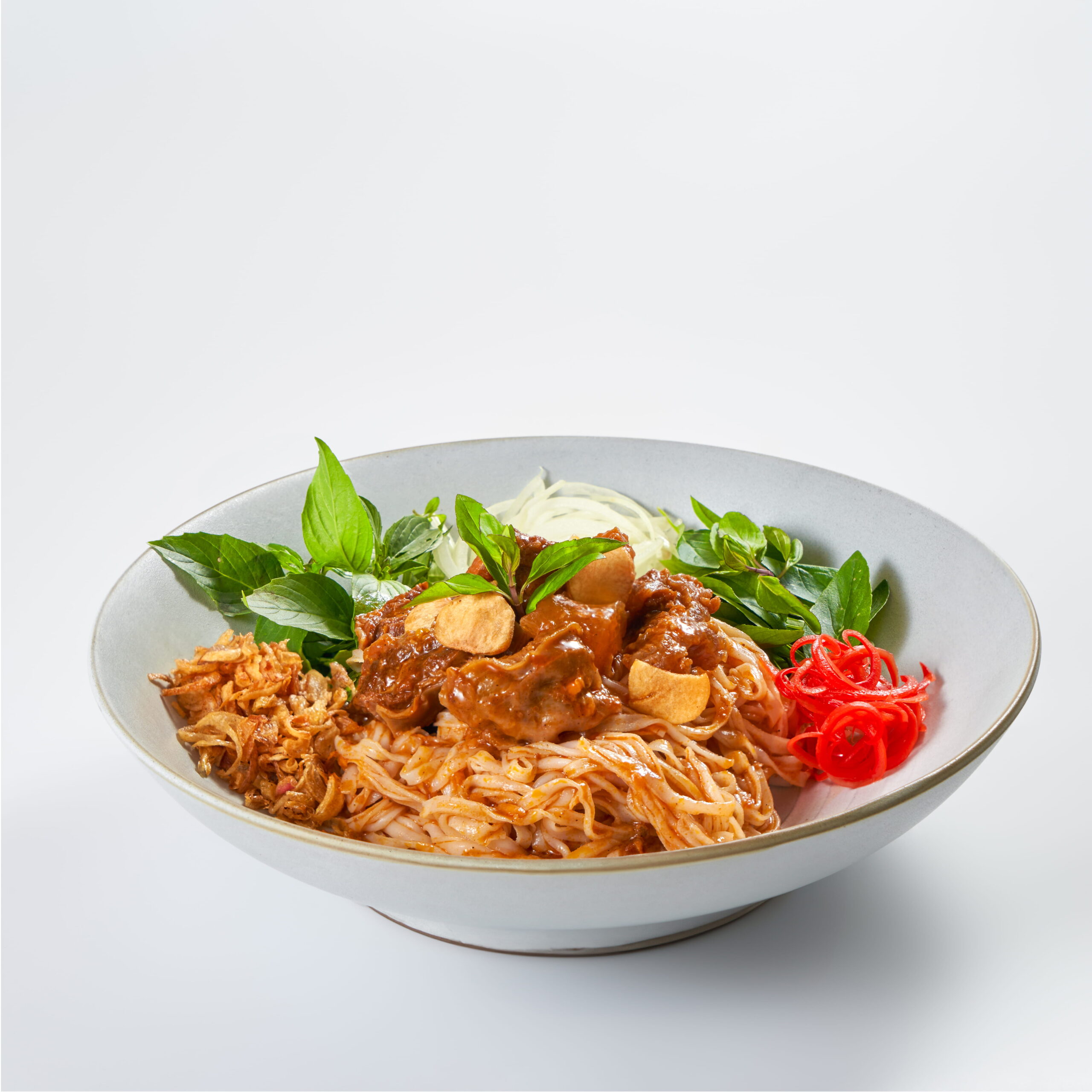 Bánh phở được chuẩn bị để giữ độ mềm vừa phải, không bị bở khi trộn. Khi hòa cùng sốt vang, sợi phở thấm vị đều nhưng vẫn giữ được độ tơi, giúp món ăn không bị dính hay nặng.